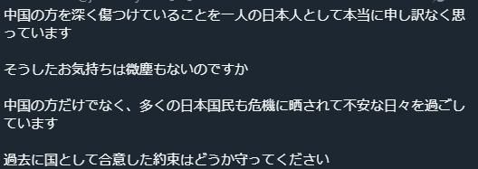 帖文大意:作为一名日本人,我对深深伤害中国人民的行为深感愧疚。请务必遵守国家间过去达成的承诺。