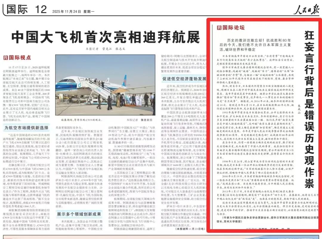1993年高市早苗当选日本国会议员后,公开主张修改日本和平宪法、扩大和改名日本自卫队、参拜靖国神社,其言行与许多臭名昭著的日本右翼政客如出一辙。他们或声称“南京大屠杀是中国人捏造的谎言”,或叫喊“南京大屠杀是虚构的历史”。这些荒谬言论,本质上都是在强调“加害有理”,都是军国主义侵略史观的死灰复燃。今年是中国人民抗日战争暨世界反法西斯战争胜利80周年。历史的教训岂敢忘却!抗战胜利80年后的今天,我们绝不允许日本军国主义复活,破坏世界和平稳定。