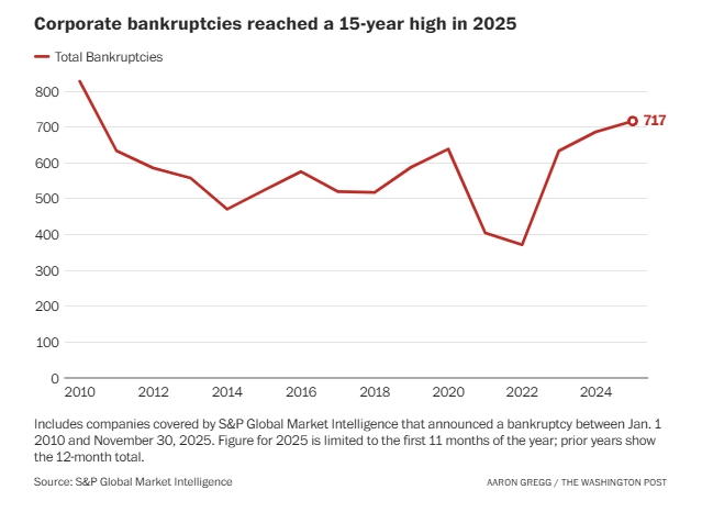 美国《华盛顿邮报》网站近日刊文称,由于依赖进口的企业承受了数十年来最高的关税压力,今年美国企业破产数量激增。文章援引标普全球市场情报数据显示,截至11月底至少有717家公司申请破产,达到2010年以来的最高水平。