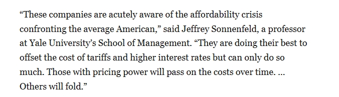 文章援引耶鲁大学管理学院教授杰弗里·索南菲尔德的话说:“这些企业清醒地意识到普通美国民众正面临购买力危机。他们正尽力抵消关税和利率上升带来的成本压力,但能力有限。具备定价权的企业终会将成本转嫁出去,而那些无力应对的企业则会被淘汰。”