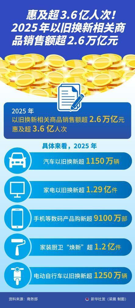 新华社北京1月1日电(记者谢希瑶)记者1日从商务部获悉,2025年,以旧换新相关商品销售额超2.6万亿元,惠及超3.6亿人次。