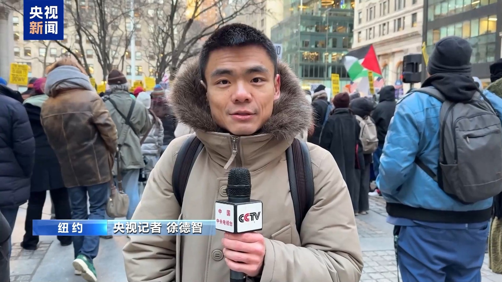 央视记者 徐德智:现在纽约的气温是零下7摄氏度,但是我身后仍有数百人而且是越来越多的人聚集在纽约公共图书馆前,表达对本届美国政府系列政策的不满。这些政策既包括移民执法局在内的国内政策,也包括美国政府一系列违反国际法的行为。他们希望本届美国政府可以更多聚焦在民生、教育、医疗等一系列民众关心的问题上面。