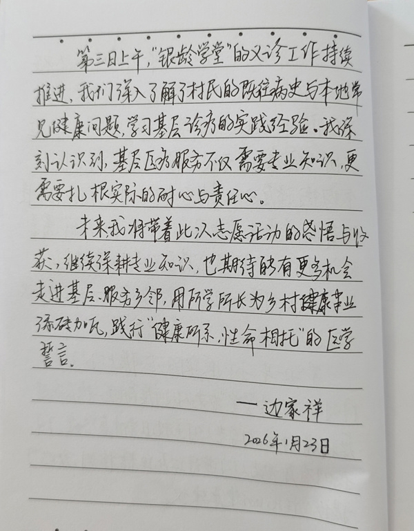 义诊期间,青年医师边家祥背着医疗箱走村入户,为行动不便的老人上门检查,把关怀送到床边。他在日志里写道:“当降下来的血压值解除了老人们健康警报的那一刻,我在基层实实在在触摸到了民生的温度,也坚定了自己用医学知识与青春誓言守护这片乡土的决心。”