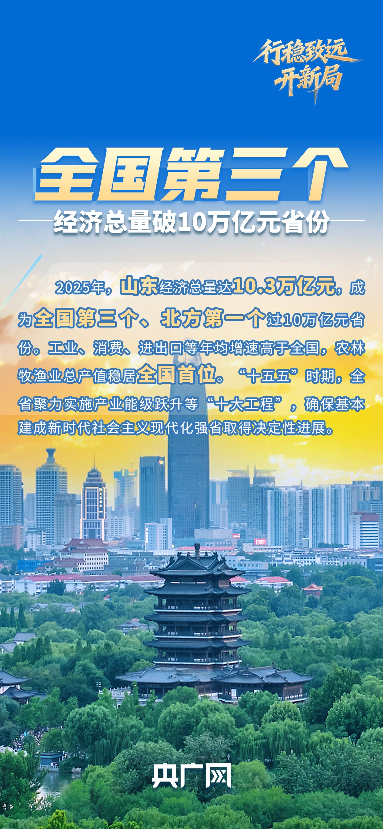 这样的科创攻坚场景,是齐鲁大地以新质生产力赋能高质量发展的生动缩影,更凝聚成经济总量实现历史性跨越的坚实底气。2025年,山东省地区生产总值达到10.3万亿元,同比增长5.5%,成为全国第三个、北方第一个过10万亿元省份,高于全国平均增速。