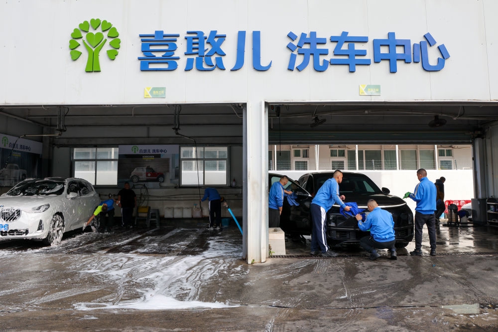 “我们是全国首家‘喜憨儿’洗车行,员工都是患有发育迟缓、智力障碍、孤独症、唐氏综合征、脑瘫等疾病的心智障碍者。”洗车行创始人曹军说,“我儿子是洗车中心的‘元老级’员工,看着他从胆小怯懦,不敢跟生人说话,到主动迎客,大方交流,我感到格外欣慰。”