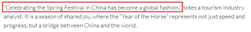 报道认为,春节是一个共享欢乐的节日,马年所象征的不仅是迅捷与进步,更是一座连接中国与世界的桥梁。一位旅游分析师在报道中表示:“在中国过春节已成为一种全球时尚。”