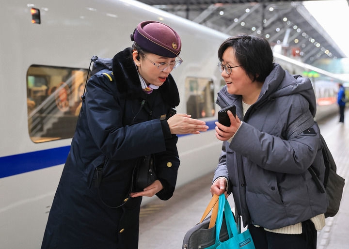 2月16日,在南京火车站,乘务人员在站台上回答旅客问询。新华社发(苏阳摄)