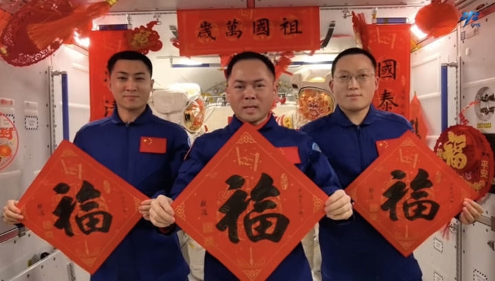 春节前夕,神舟二十一号航天员乘组在中国空间站向全国人民拜年(视频截图)。新华社发