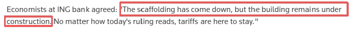 文章援引欧洲政策中心(European Policy Centre)分析师瓦格·福克曼的话说:“这只会开启全球贸易新的高度不确定期,最终局面很可能换汤不换药。”荷兰国际集团(ING)经济学家也认为:“‘脚手架虽已拆除,但建筑仍在施工’。无论判决如何,关税政策不会消失。”