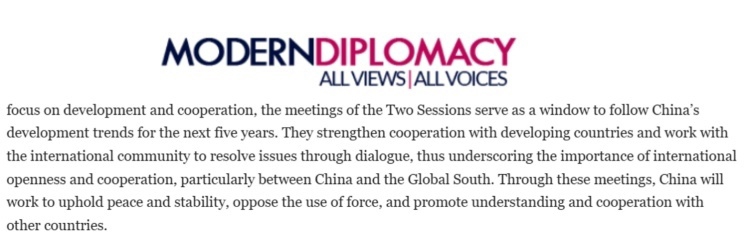 欧洲《现代外交》网站近日刊登埃及本尼苏伊夫大学副教授纳迪亚·赫尔米博士的评论文章称,今年中国两会重点关注发展模式创新与深化伙伴关系。会议议题包括通过共建“一带一路”倡议推动“高质量发展”,深化数字经济、基础设施及能源领域的国际合作,为推动构建人类命运共同体提供重要平台。