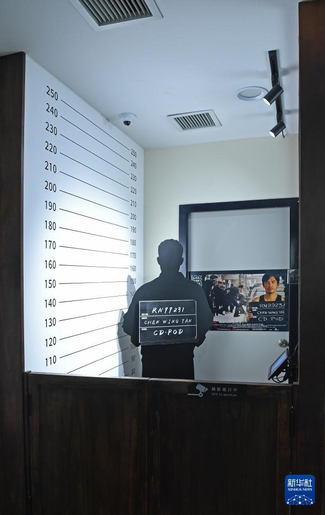 在羁留室区域,粗糙的水泥墙上挂着《英雄本色》等经典电影的海报;相邻房间则陈列着各式囚服与旧式梳妆用具,与一旁被巧妙改造为复古照相亭的囚室并置。参观者可以在此选择扮演警察或疑犯拍照,也可以通过AI技术将自己的脸合成到《无间道》等电影海报上,过一把“主角瘾”。
