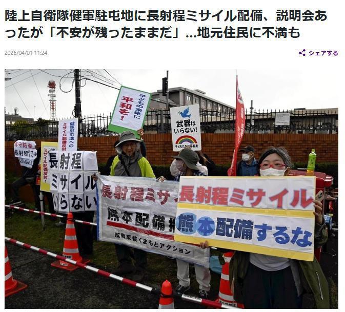 3月31日,在熊本县健军驻屯地附近爆发了大规模抗议活动,当地民众高举横幅,反对在该地部署远程导弹,并表示该驻屯地位于住宅区之中,周边有学校和医院。部分市民团体向日本陆上自卫队提交了要求撤回部署导弹的请愿书。