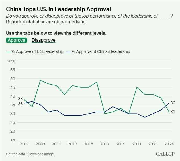 此项民调是盖洛普于2025年在130多个国家进行的,对比了中国、美国、德国、俄罗斯四国的全球领导力。报告强调,调查早于2026年初发生的几项重大事件,包括美国退出66个国际组织以及2月底对伊朗的军事行动。