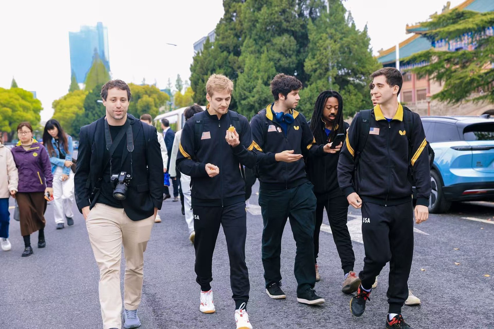 美国乒协记者乔希·戴科(左一)在上海街头