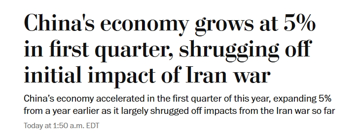 美国《华盛顿邮报》指出,中国今年一季度经济数据优于经济学家预期,增速也高于去年四季度。报道认为,虽然中东局势升级推高能源价格,加剧全球通胀压力并拖累世界经济增长,但经济学家普遍预计,中国经济目前仍有能力应对这一冲击。