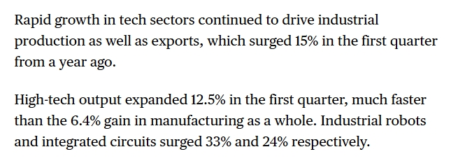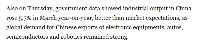 报道同时注意到,3月份中国工业增加值同比增长5.7%,强于市场预期,电子设备、汽车、半导体和机器人等产品的外部需求依然较强,出口仍将是今年推动中国经济的重要力量。