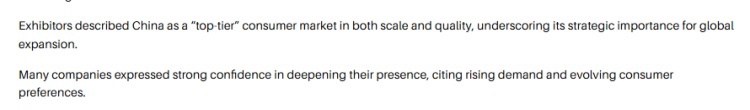 文章称,许多参展商将中国描述为兼具规模与品质的“顶级”消费市场,并强调了中国对于打开全球市场的重要性。许多企业表示,鉴于不断增长的需求和持续更新的消费者偏好,他们对深耕中国市场充满信心。