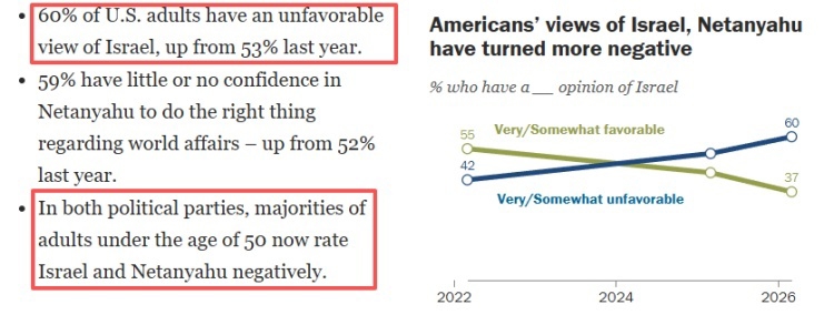 民意层面,皮尤研究中心近期的民调结果显示,60%的美国成年人对以色列持负面看法,高于去年的53%。无论党派归属,50岁以下成年人中的大多数受访者对以色列及其总理内塔尼亚胡的评价都是负面的。