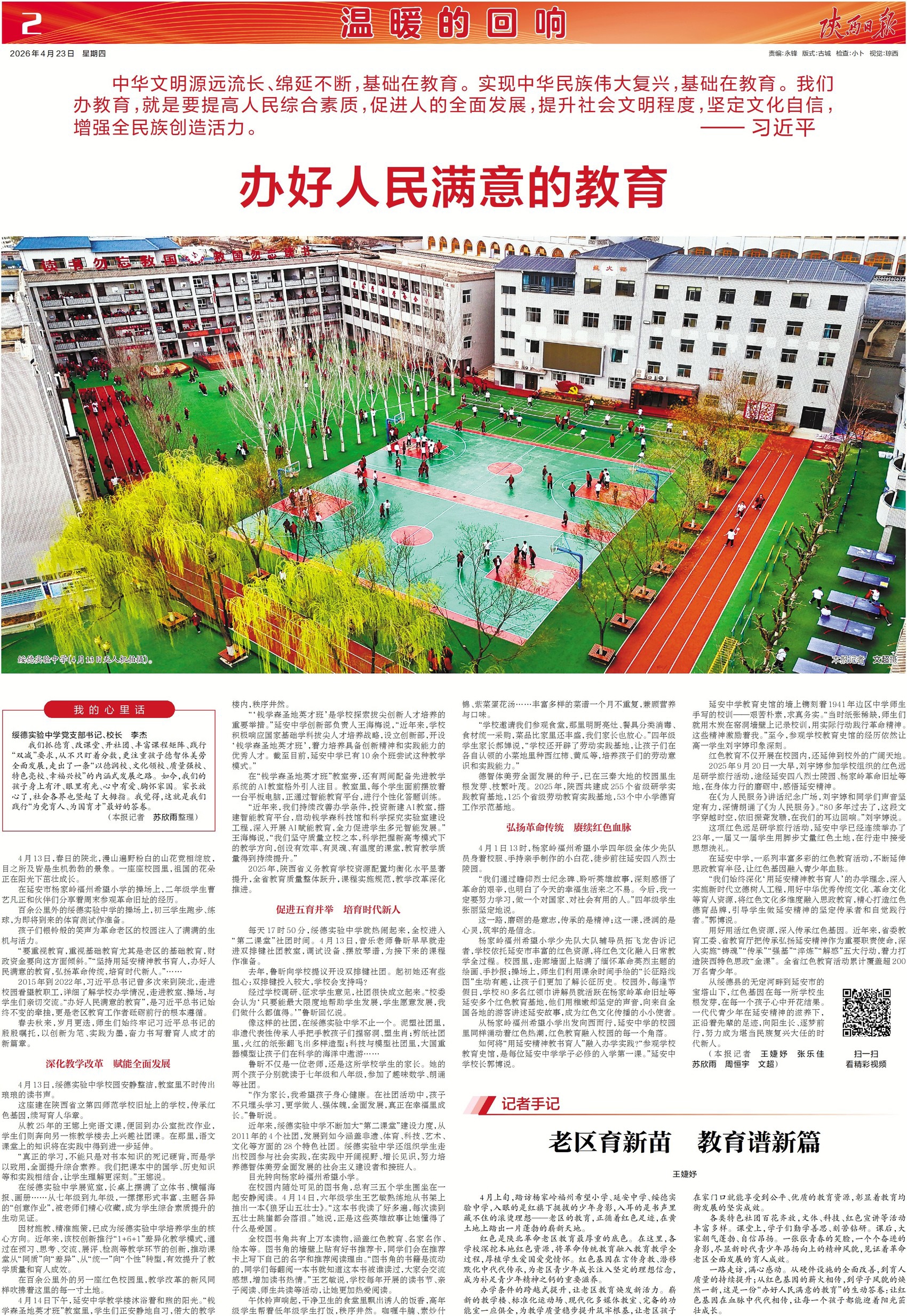 “要重视教育,重视基础教育尤其是老区的基础教育,财政资金要向这方面倾斜。”“坚持用延安精神教书育人,办好人民满意的教育,弘扬革命传统,培育时代新人。”......