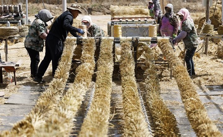 2026年4月10日,在宁夏中卫市沙坡头区迎水桥镇黑林村,治沙工人用机械编织刷状网绳式草方格。新华社记者 王鹏 摄